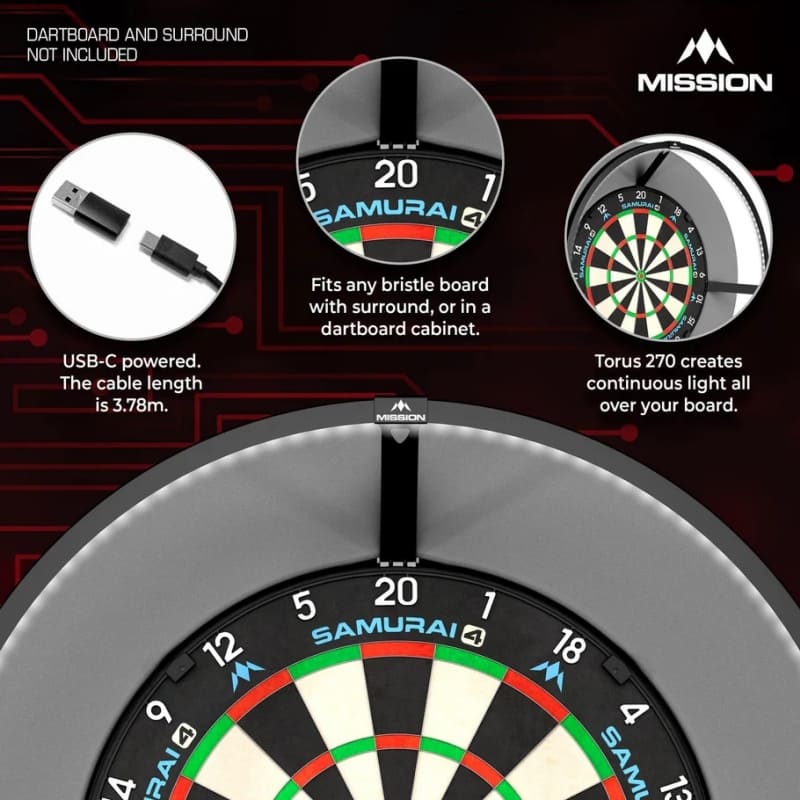 Mission Torus 270 is een eenvoudige manier om je dartbord te verlichten, zonder schaduwen, om je zicht op het bord te verbeteren. Het verlichtingssysteem kan snel op elk dartbord worden geklikt en de unieke vorm van 270 graden geeft je gemakkelijk toegang om je darts op te halen tijdens het spelen, wat ook ideaal is voor jeugdspelers.